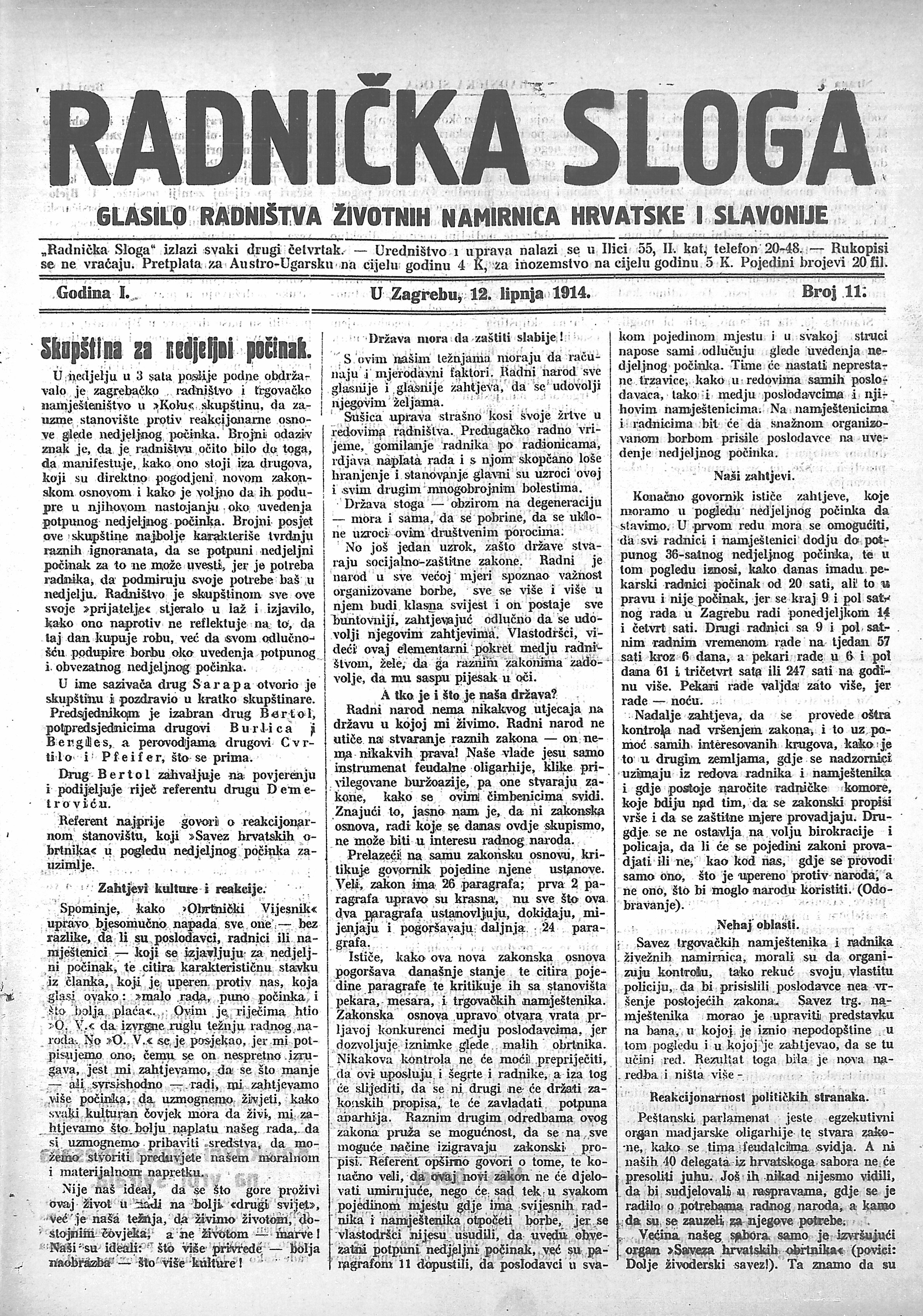 Država mora da zaštiti slabije, Radnička sloga, 12. lipnja 1914.