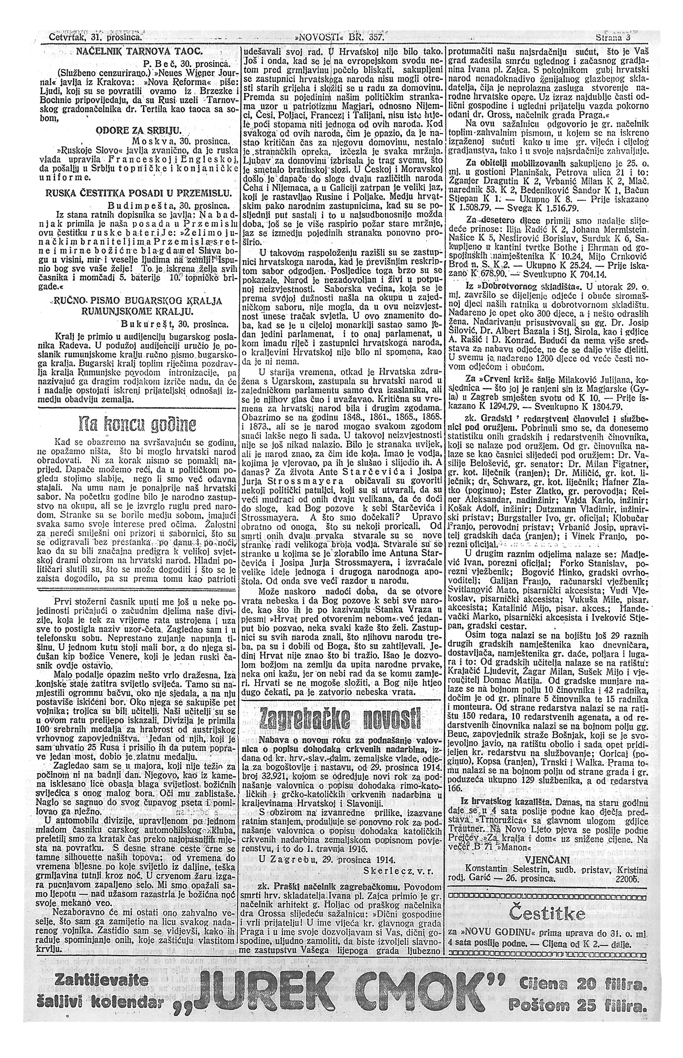 Novosti, 31. prosinca 1914.
