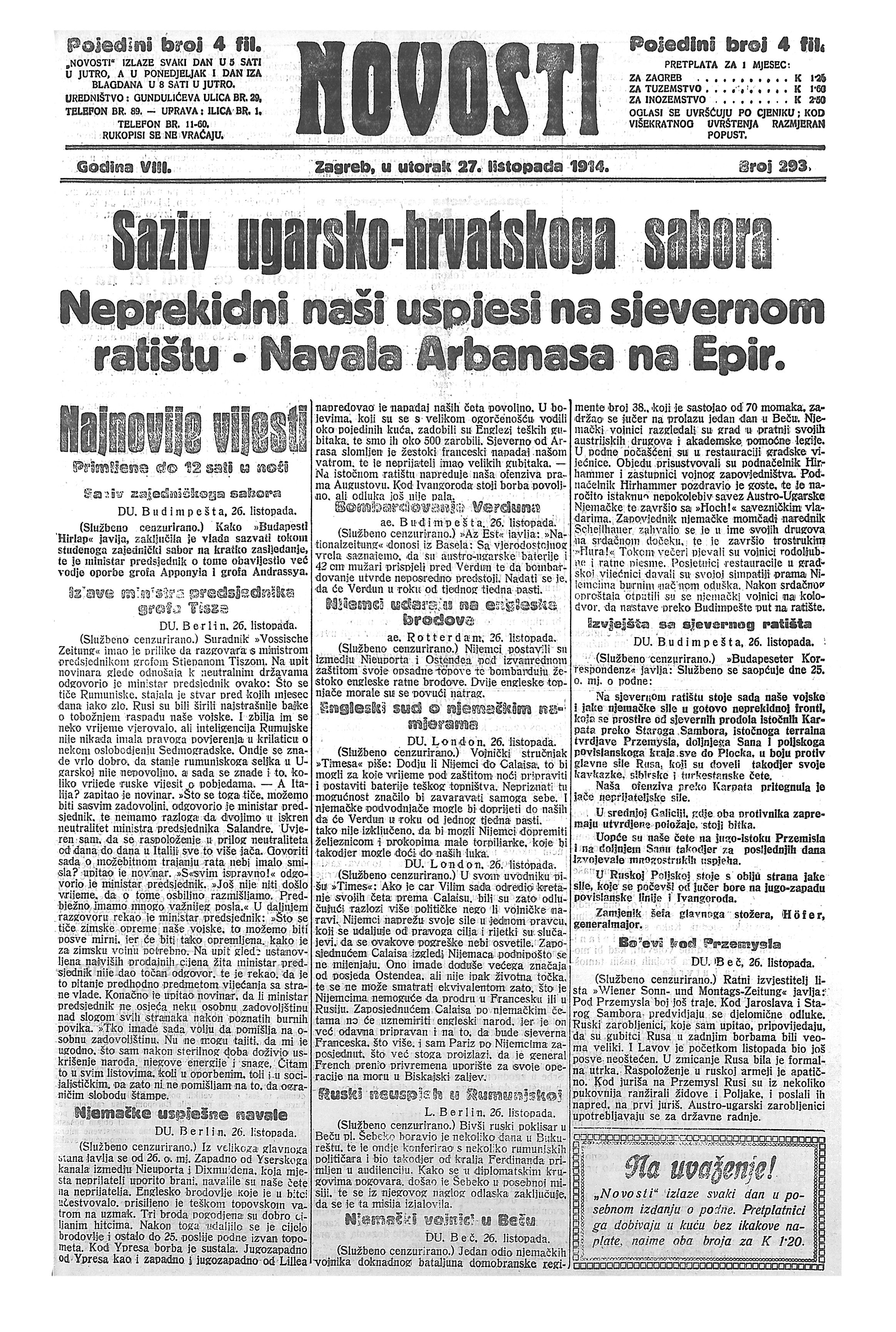 Novosti (Jugoslavenska štampa), 5. studenog 1914., slika 1
