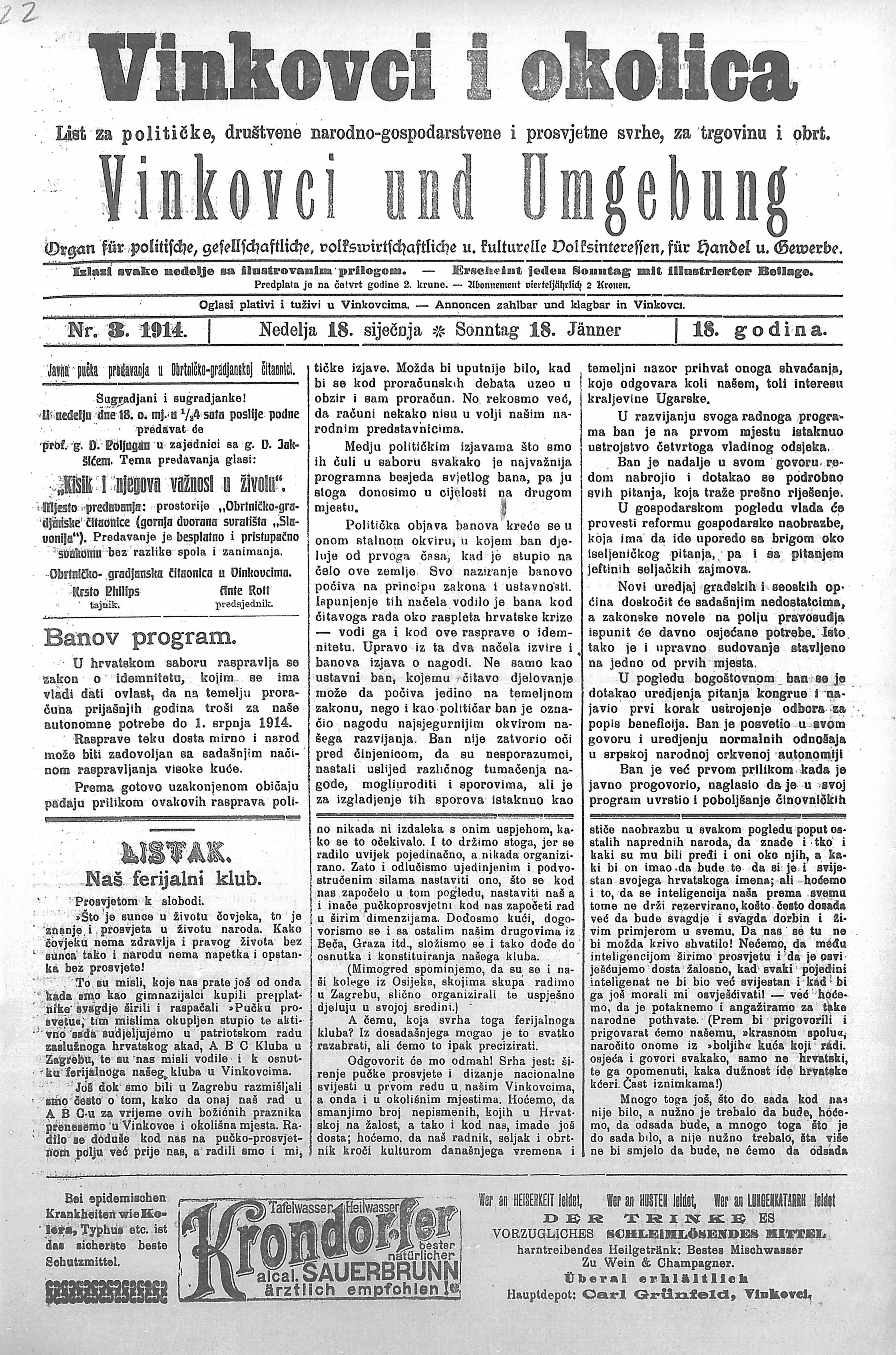 Izvor: Vinkovce und Umgebung 18. siječnja 1914., str. 1