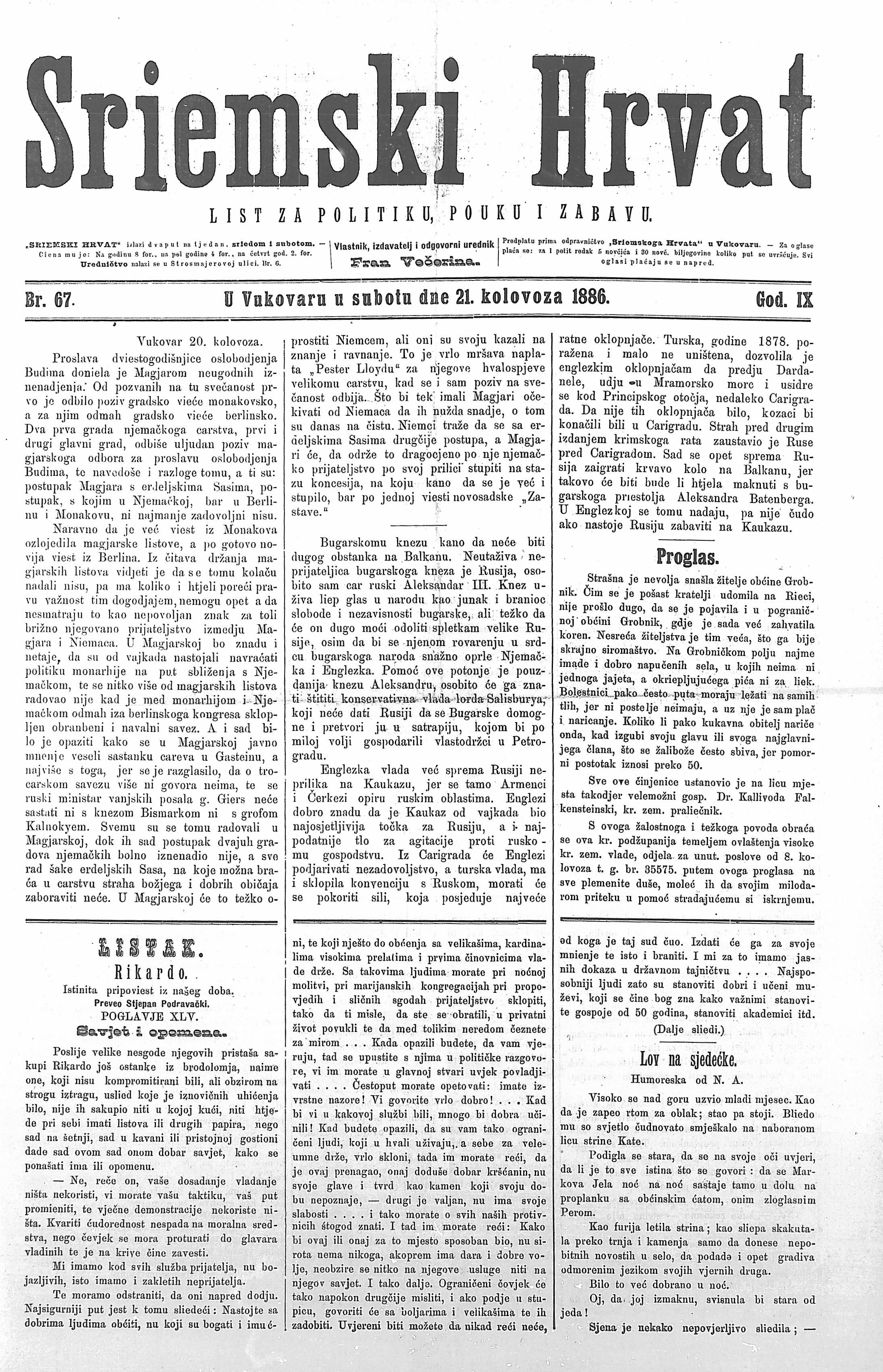 Sriemski Hrvat, Vukovar, god. 9 (1886), br. 67, 21. kolovoza, str. 1-2.